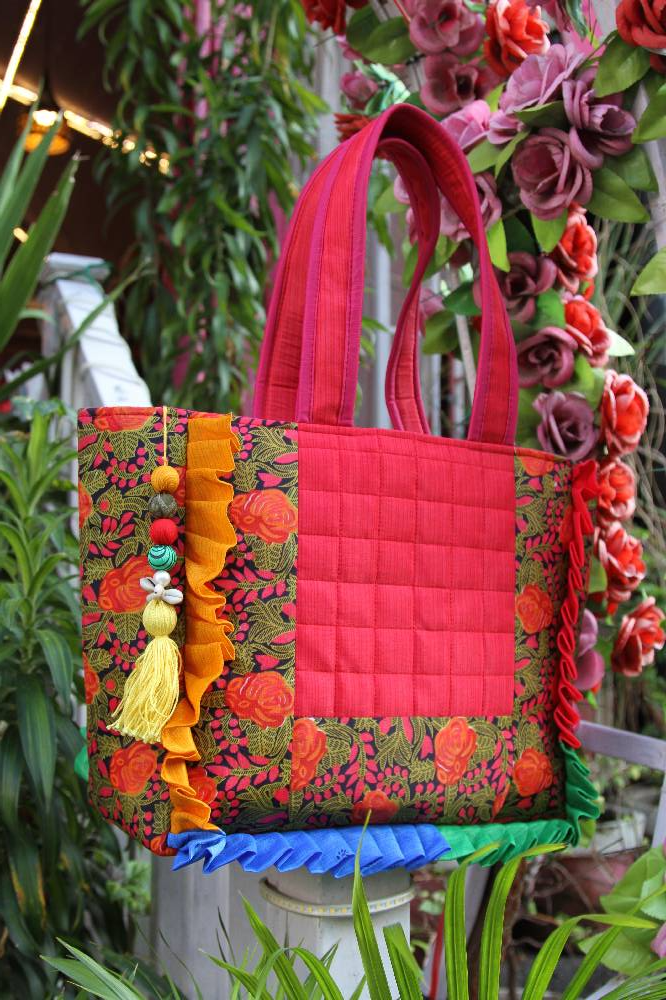 Fine offcuts of enchanting patterns are precisely wedded to each other and given an ergonomic silhouette to form this patchwork tote bag. The spacious interiors encourage utmost utilisation of the space within and the captivating guise serves as the ultimate fashion statement. Pack your world in style! This piece is 100% upcycled and is handmade by the utterly talented artisans of Mathura India.